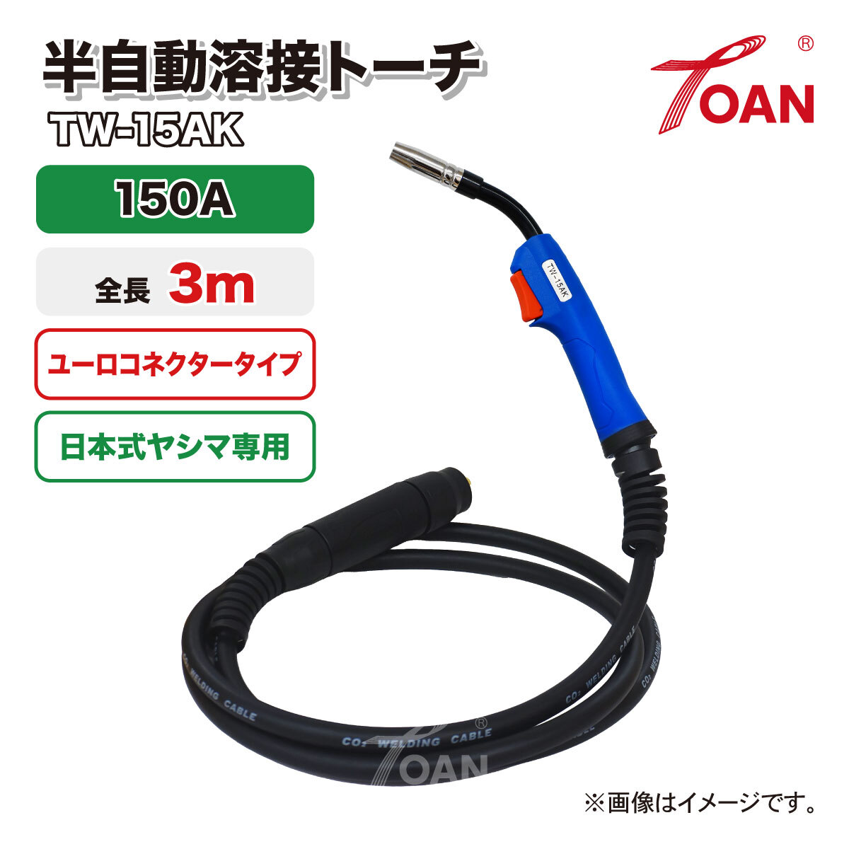 > 半自動溶接機 CO2トーチ 日本式 ヤシマ 150A 全長:3m TW-15AK ユーロコネクター式 (溶接機適合機種 代表例: WM-210MO MIG210S 海外溶接機)