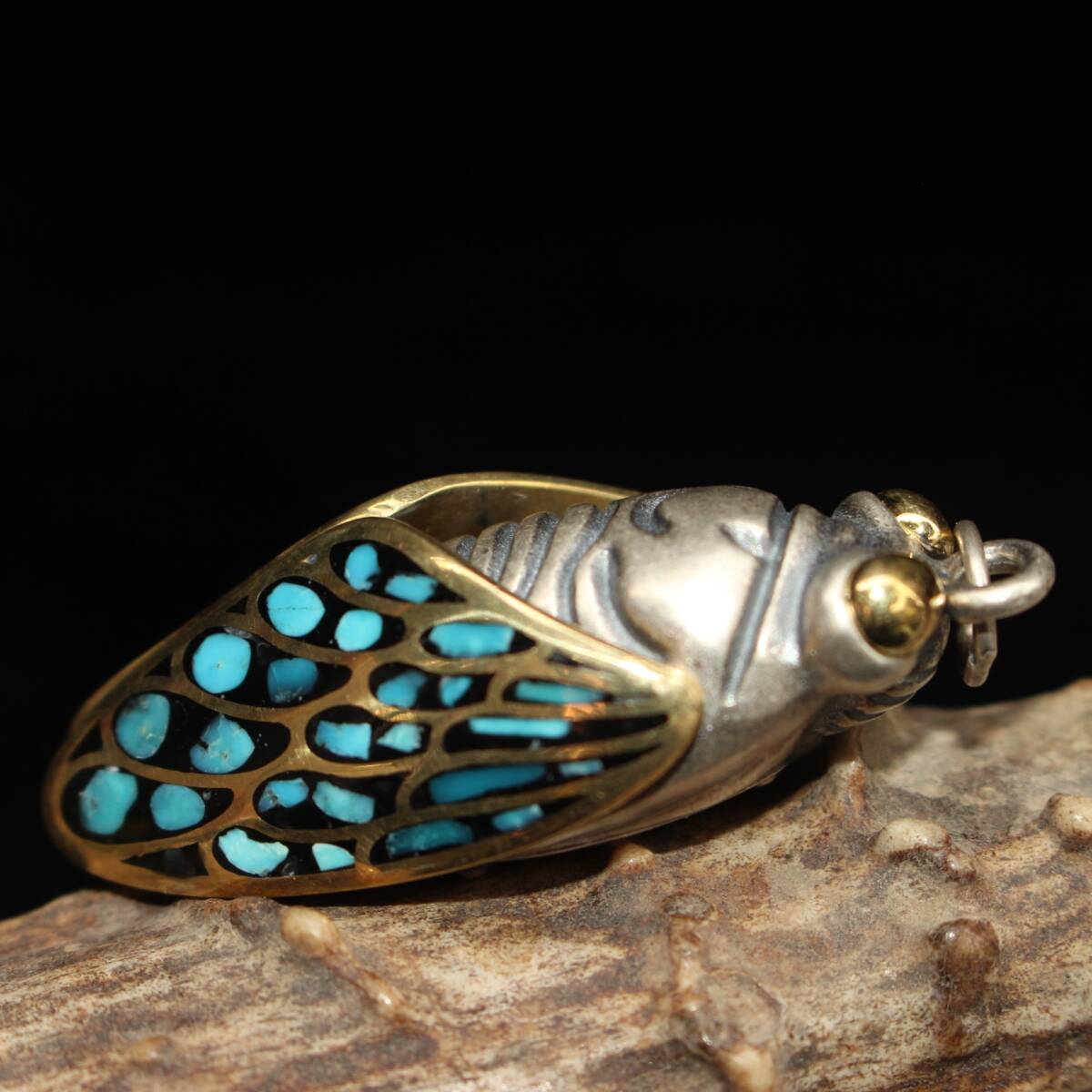 > 9+GV4202「東洋美術」 【烏蘭花、トルコ石、蝉を象嵌したスターリングシルバーのペンダント】 旧物 孤品 珍品 収蔵価値が高い