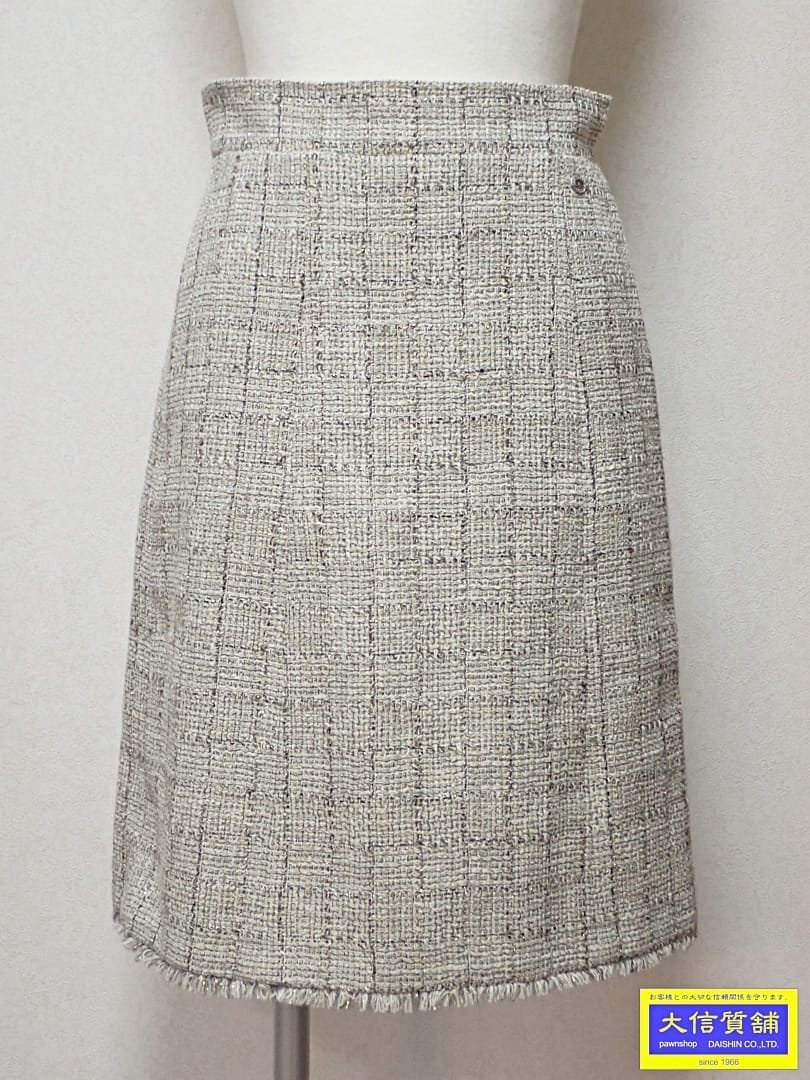 > CHANEL シャネル ツイード スカート 38 10P P38355 ココプレート ラメ糸 コットン ベージュ×ゴールド 中古A 【送料無料】 A-8915