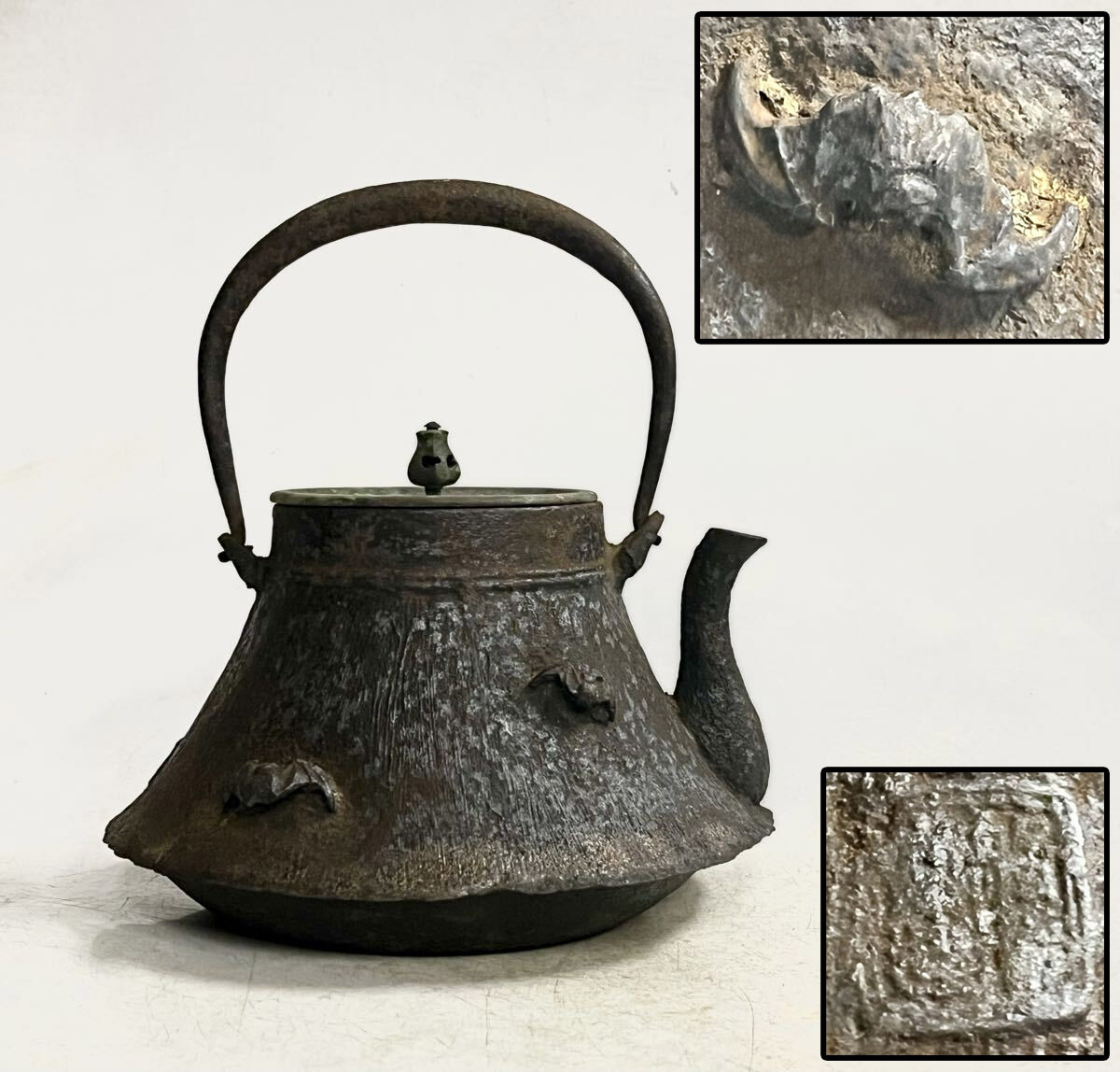 - 般清堂造 胴在銘 透かし盛上蝙蝠地紋 富士形鉄瓶 唐銅蓋花形虫食い摘 提手銀象嵌 煎茶道具