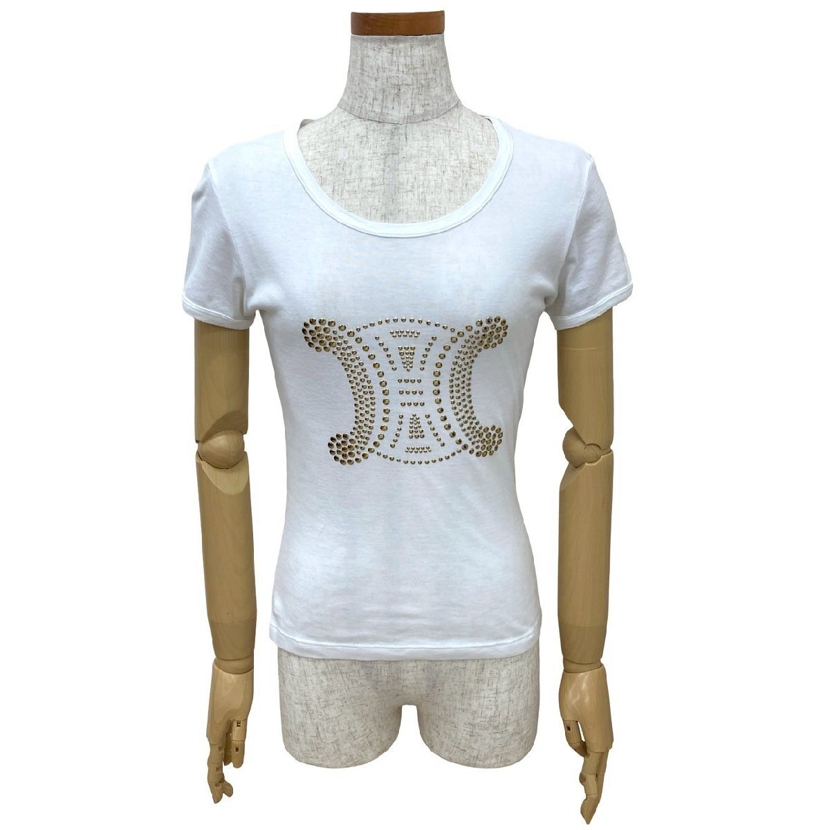 - 極 美品 CELINE セリーヌ マカダム ロゴ スタッズ コットン 半袖 Tシャツ Sサイズ トップス レディース ホワイト 32519