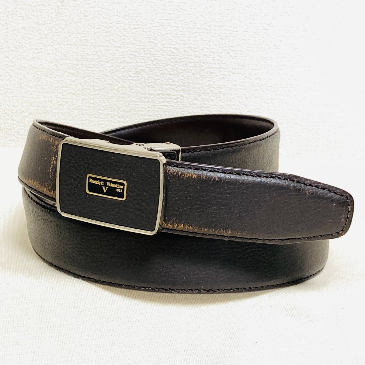 - Rudolph Valentino ロゴ デザイン バックル LEATHER/本革 レザー ベルト ブラウン/焦げ茶系 穴なし フリーサイズ