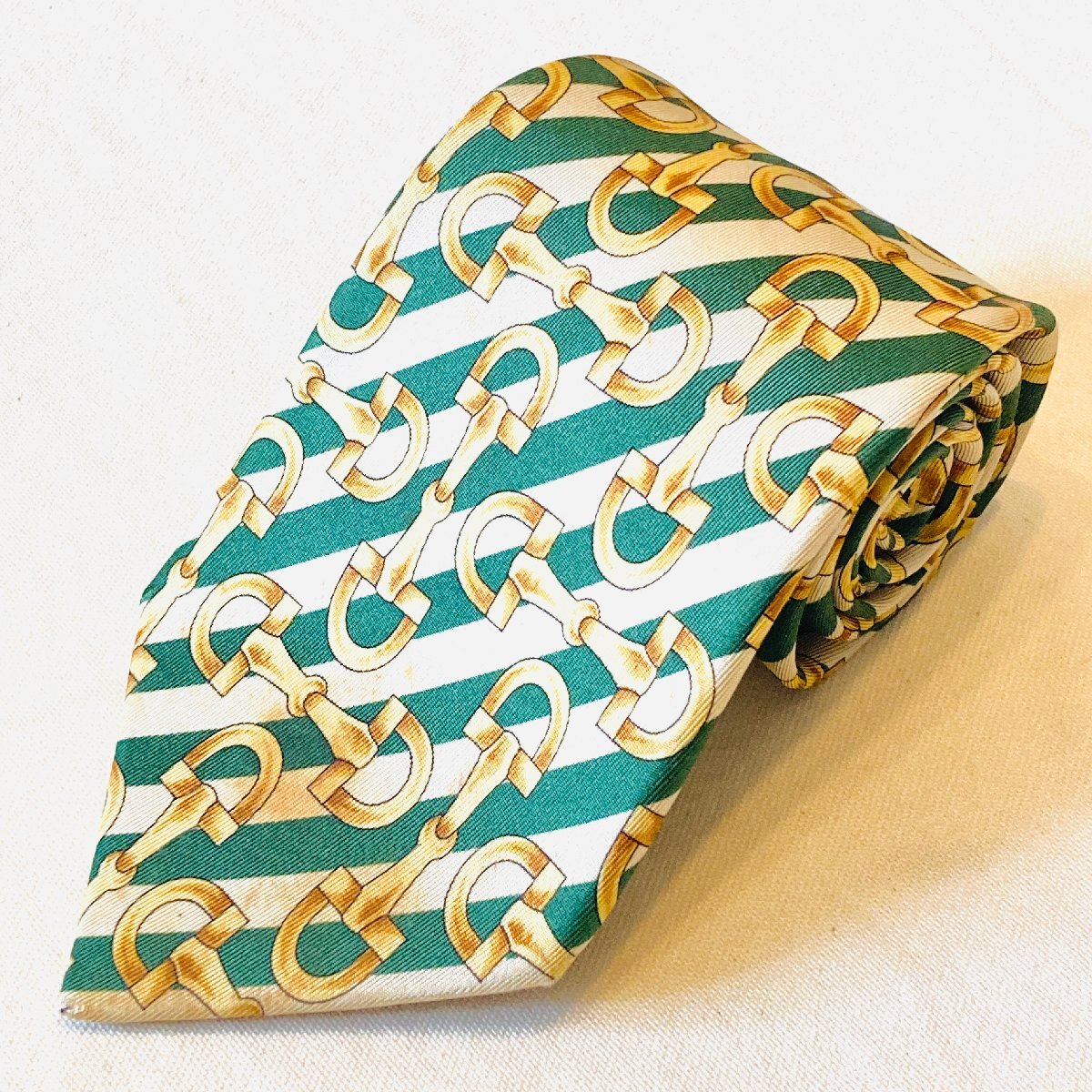 > CELINE PARIS セリーヌ イタリア製 絹 シルク SILK 100% 高級 ネクタイ グリーン/ベージュ系 総柄 ストライプ