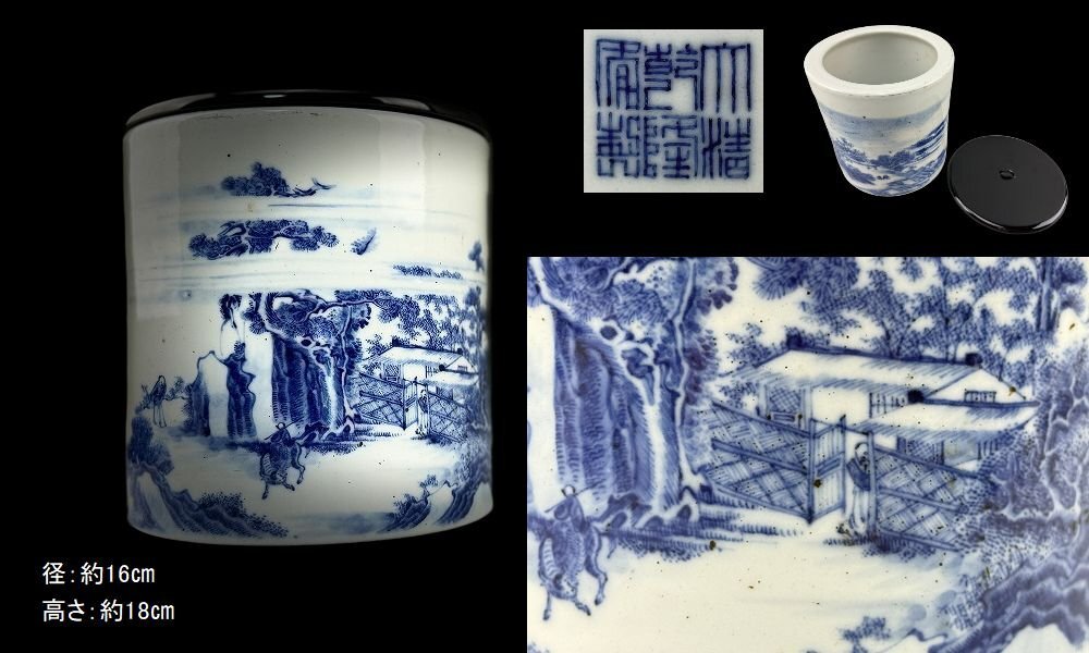 - J1981青花染付 水指 大清乾隆年製款 蓋付 人物山水図染付絵 中国清時代美術焼物(B)