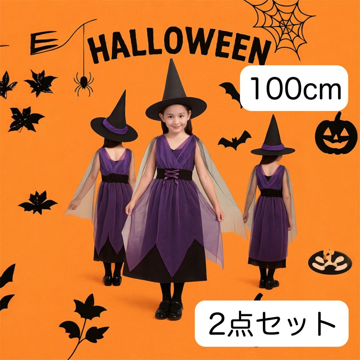 - 魔法使い コスプレ 100cm 2点 ワンピース 帽子 ハロウィン パープル キッズ かわいい