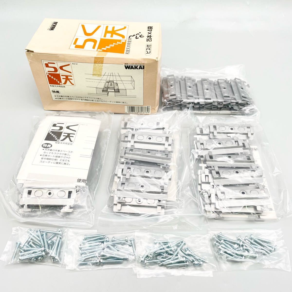 - [新品 未使用品] ワカイ らく天 和室天井用金具 55×25mm 100枚 天井板 桟 梁 大工 建築資材 ビス付 WAKAI 金物屋 在庫品 まとめ売り