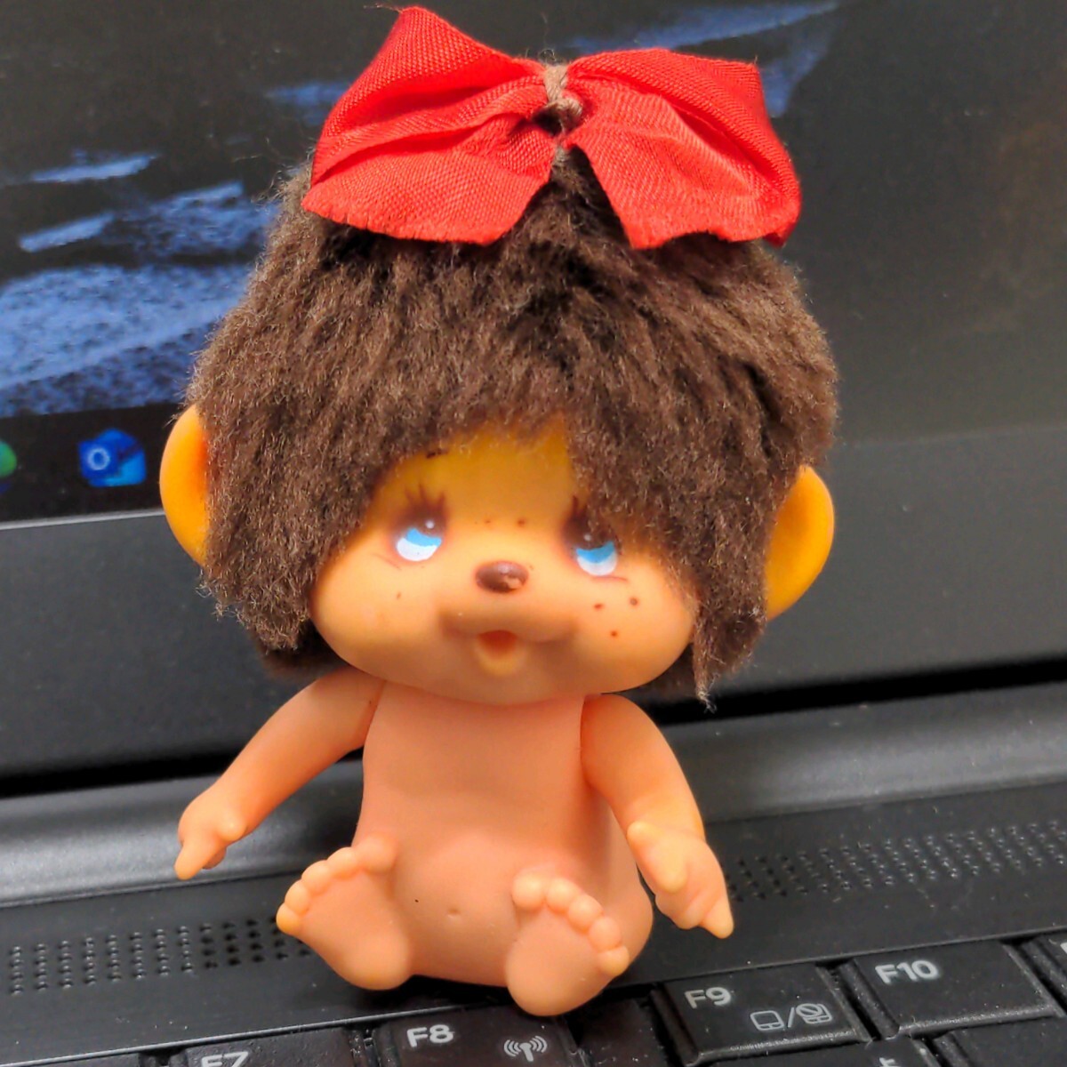 - かわいいです! さる 人形 モンチッチ? 昭和レトロ 古い アンティーク ソフビ 体毛がない 約7.5cm 赤いリボン