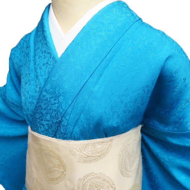 - 色無地 着物 未使用 正絹 袷 セミフォーマル 紋付き 地模様 花鳥模様 金春色 身丈168cm 裄69cm L トール きもの北條 A1275-8