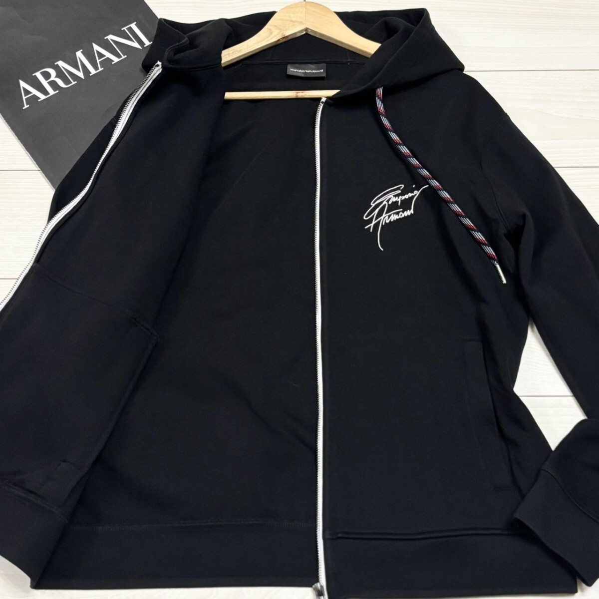 > 極美品/3XLサイズ●EMPORIO ARMANI エンポリオアルマーニ ジップアップパーカー 筆記体ロゴ 袖イーグルモチーフ ブラック メンズ アウター