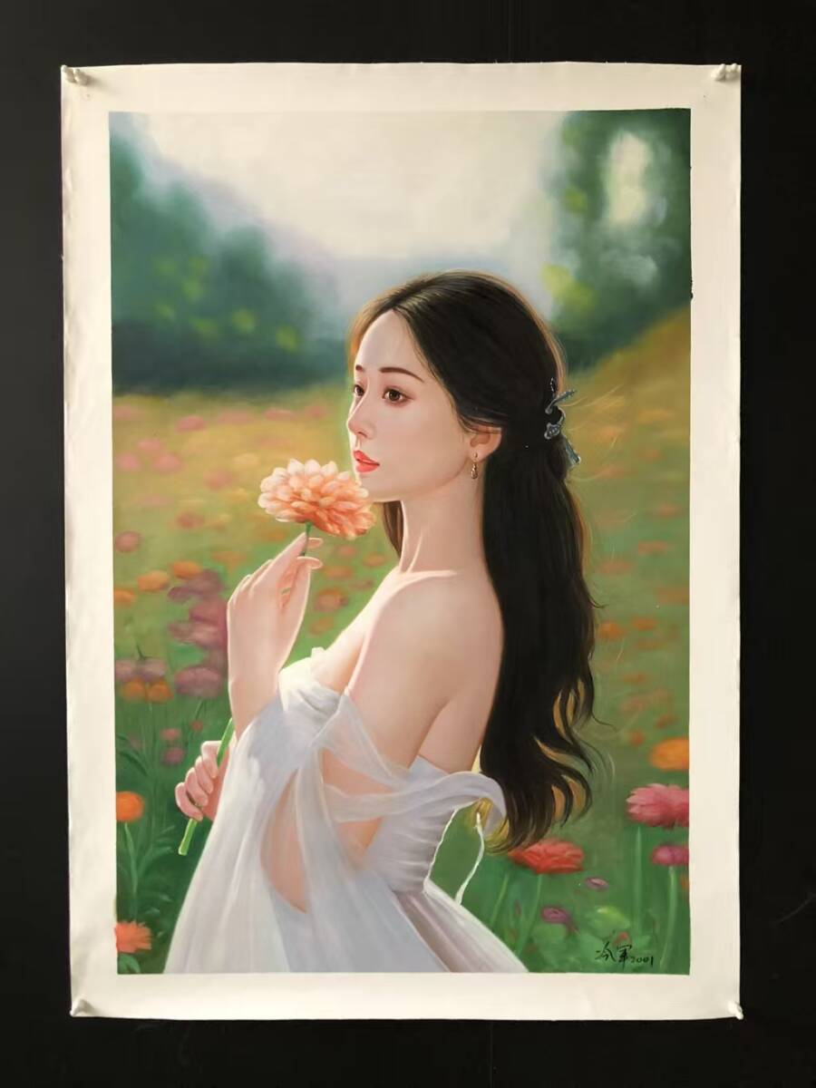 - 油彩 絵画 早期收集 h14【冷軍】美女》美人畫 】手描き布油絵 油畫 旧藏 中国古画 純手描き画 古美術品 時代物 中国古玩 骨董品 925