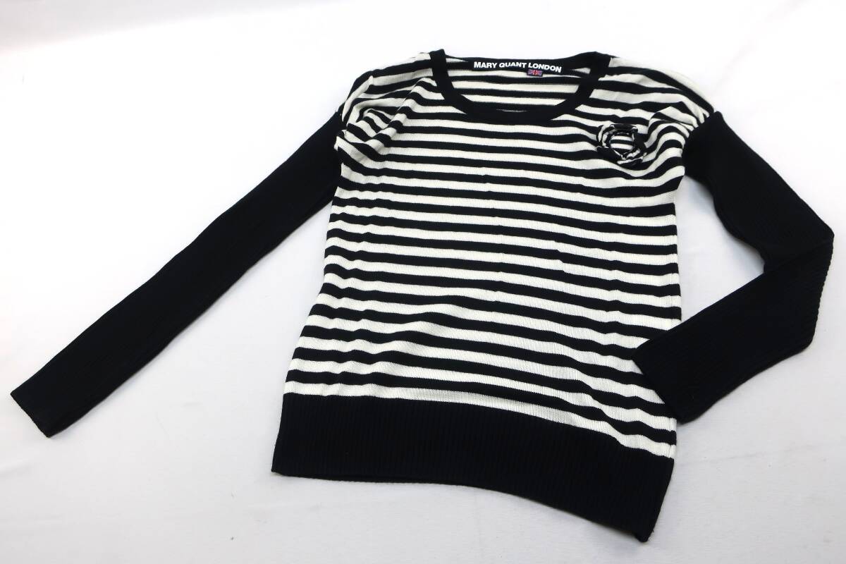 > 【送900円】1439 MARY QUANT LONDON マリークワント ボーダーニットトップス セーター リブ 白×黒 コサージュ アクリル×毛 M(38)