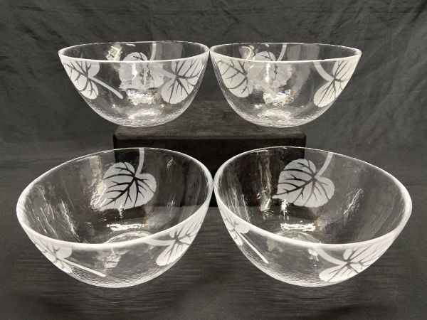 > 【R147】高級食器 美品 ガラスボール大 4点セット サラダボール フルーツボール 海外製 葉模様 直径17cm/高さ8.5cm b
