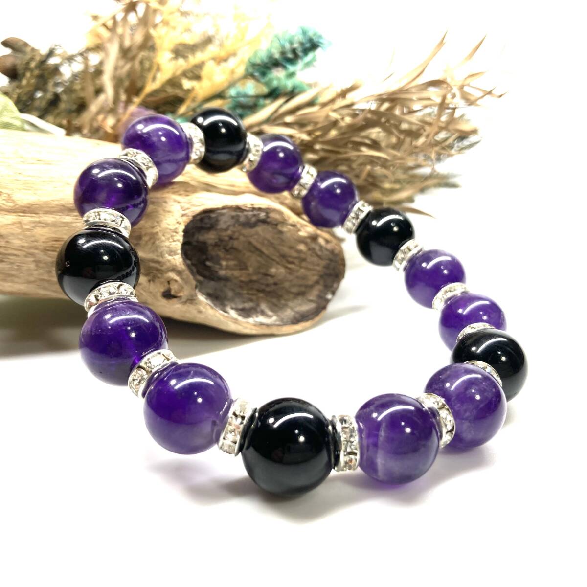 - オニキス&アメジスト パワーストーン ブレスレット 天然石ブレス (シルバー) 12mm 金運 仕事運 メンズ・レディース 男性 女性