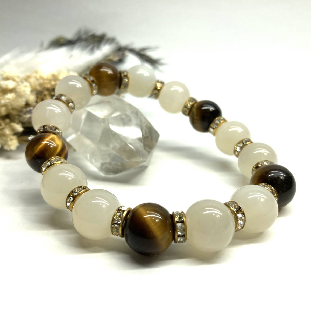 - ムーンストーン&タイガーアイ パワーストーン ブレスレット 天然石ブレス (ゴールド) 12mm 幸運 開運 メンズ 男性♪