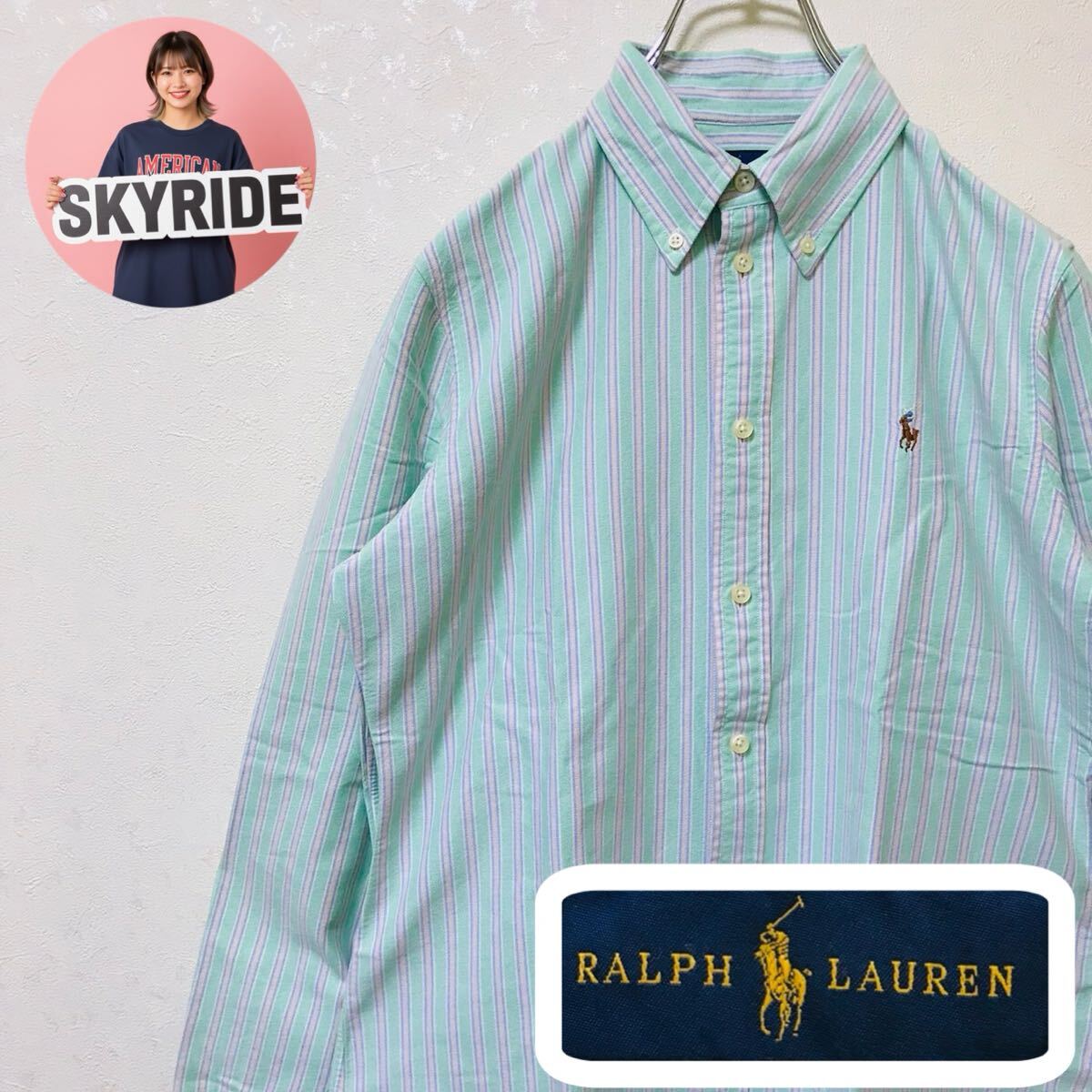 > 【美品】RALPH LAUREN ラルフローレン 00s 長袖シャツ ボタンダウン グリーンストライプ M ポニー刺繍 コットン100% 古着 #TT0335