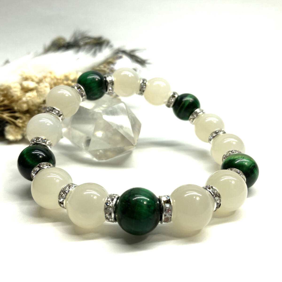 - ムーンストーン&グリーンタイガーアイ パワーストーン ブレスレット 天然石ブレス (シルバー) 12mm 幸運 開運 メンズ 男性♪