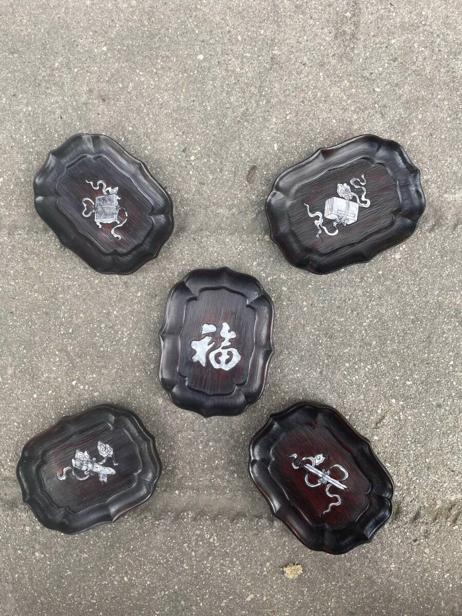 - 蔵友旧蔵出 黑檀木製 細密彫 貝殼嵌 琴棋書画紋 茶杯盤 五點同出 文房具 供養品 置物擺件 稀少珍藏品 古賞物 中国古玩 中国古美術品
