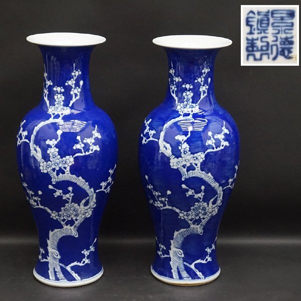 > 中国美術 中国古玩 景徳鎮銘 染付花図文 特大 対 2点 花瓶 花生 高さ61cm 飾壷 唐物 磁器 陶芸 陶器 陶製 陶磁 時代 骨董 古美術品