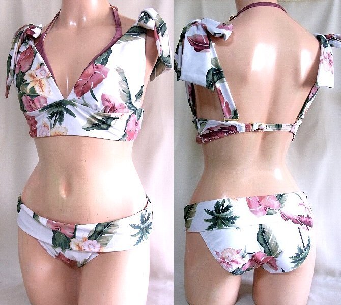 - ★☆結び肩ひも付きピンク花柄入り白ビキニ水着☆★