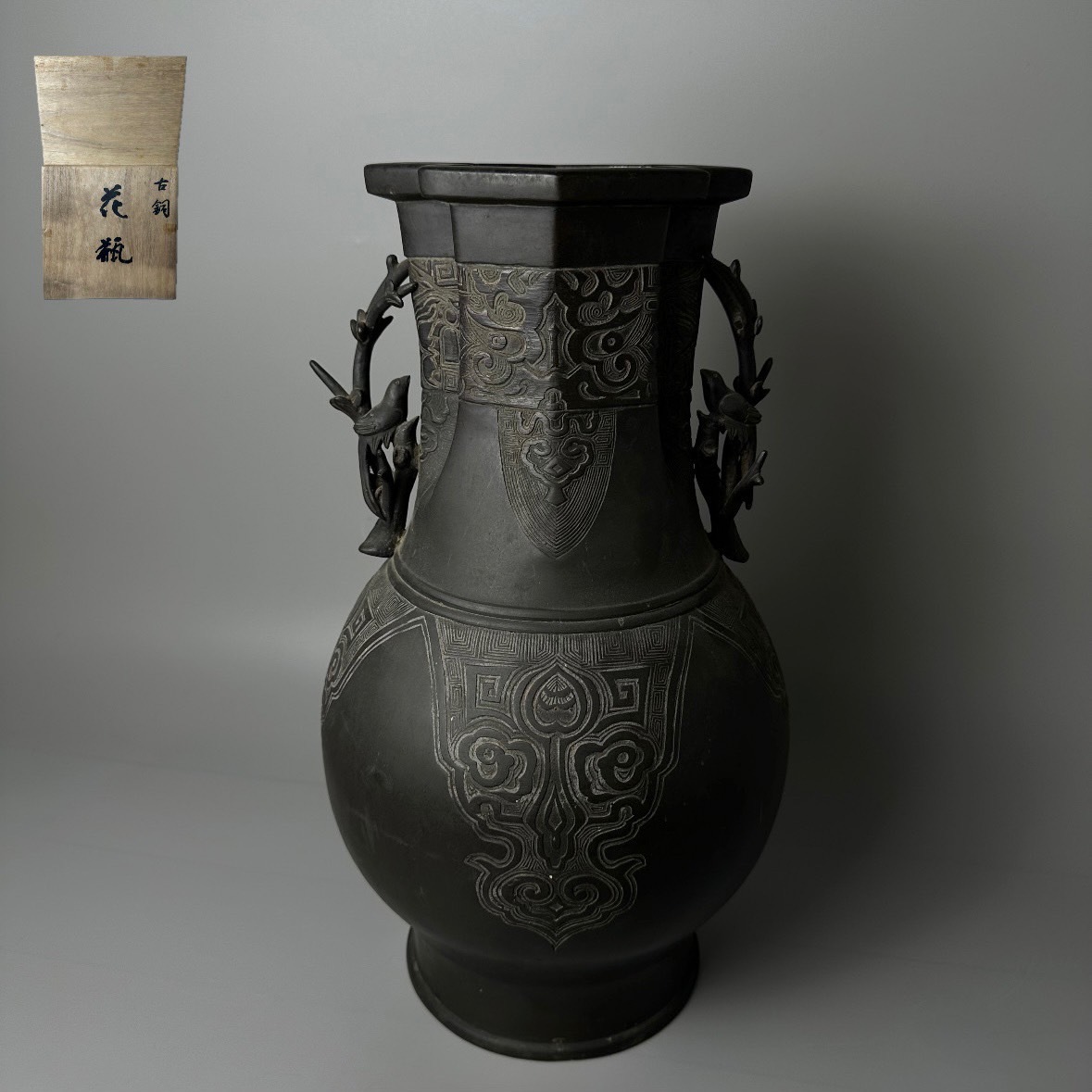 - コレクター買取品 中国美術 古銅製 双耳付花瓶 39.5㎝ 鳥紋 箱付 唐物 飾壺 花入 花器 細密彫刻 中国古玩 飾物 置物 時代物 骨董品 古美術