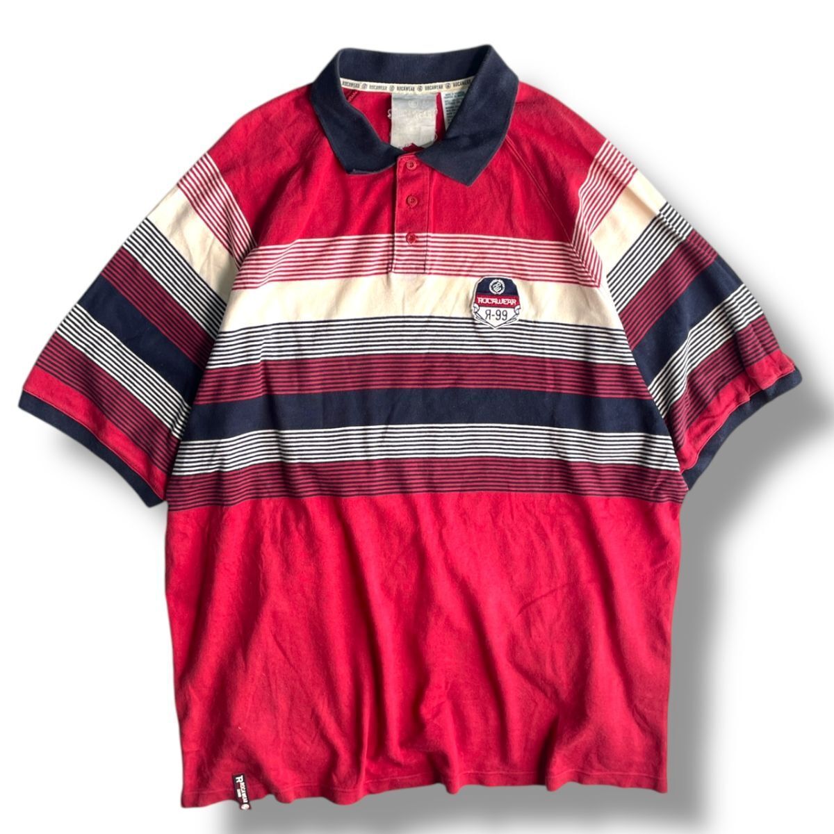 - 希少 ROCA WEAR ロカウェア メンズ 3XL ボーダー半袖ポロシャツ 大きめ ビッグサイズ XXXL マルチカラー 襟付き Tシャツ コットン 古着