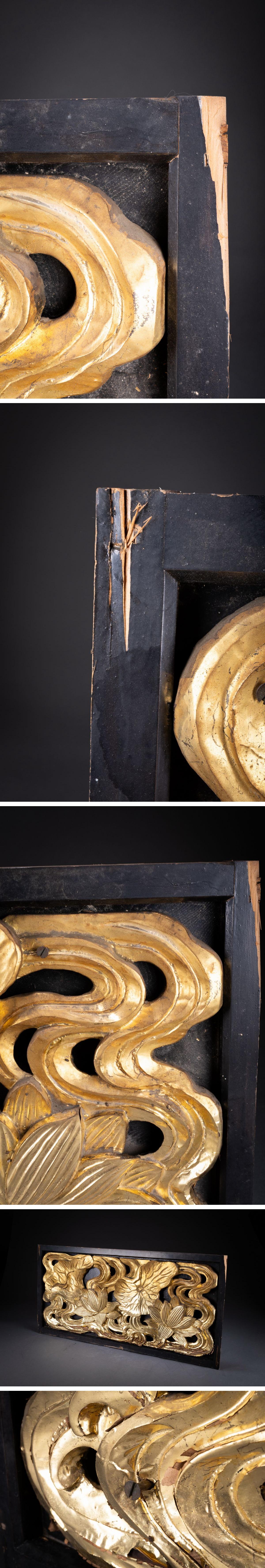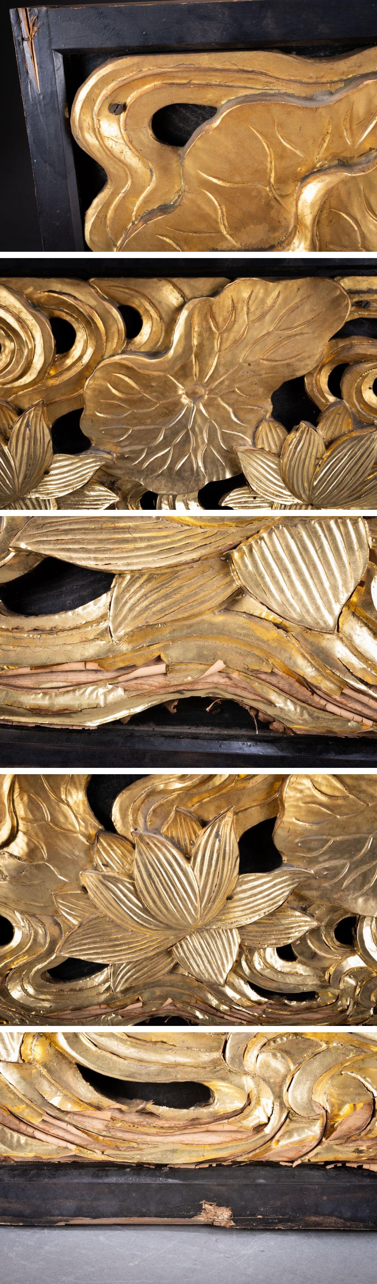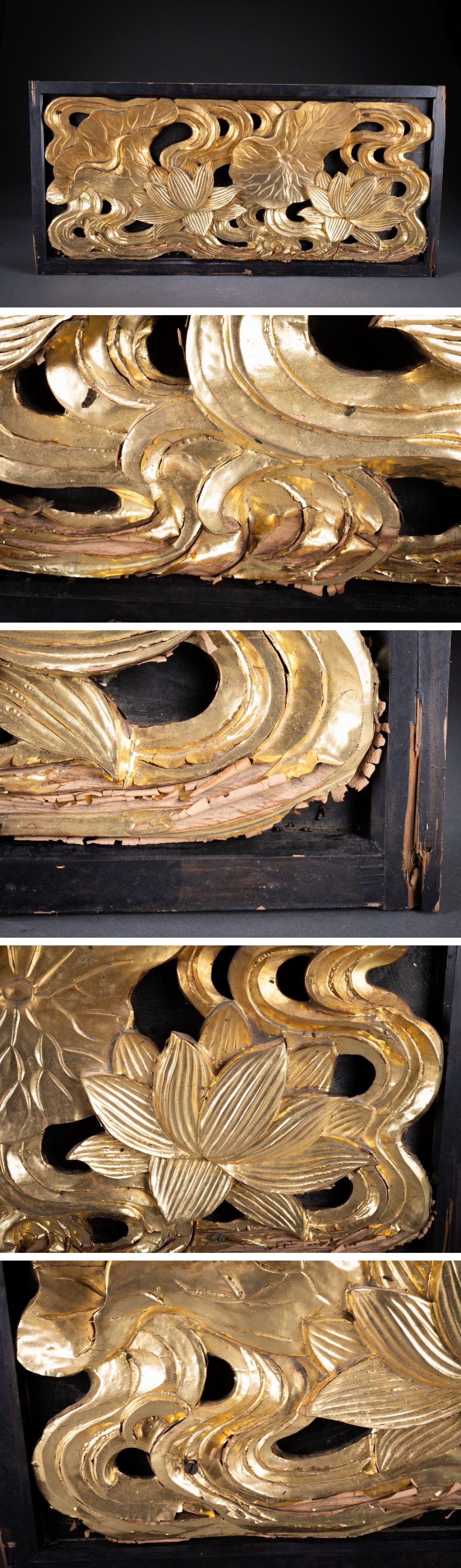 > 【雲錦】某有名オークション購入 寺出欄間 木彫色絵金彩 蓮花紋欄間(幅101㎝)和彫り 傷あり 激レア 仏教美術品7L8-300