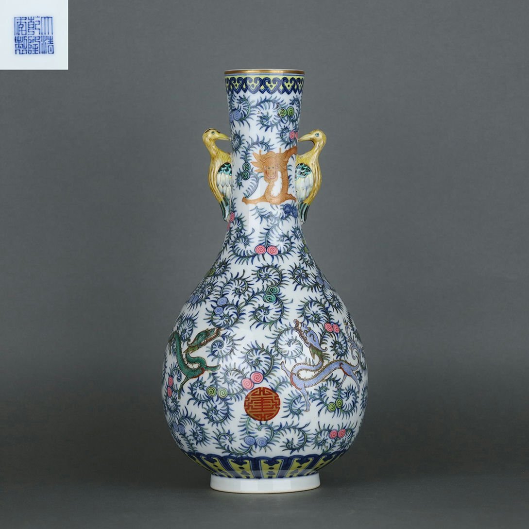 - ▼渡鶴羽▼A650清乾隆 青花加彩鳳尾草寿字蛟龍紋鸚鵡耳瓶・古陶磁器 ・珍品旧蔵・古賞物・時代物