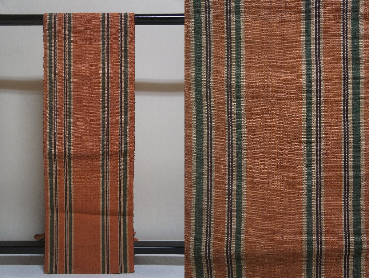 - 正絹紬地団十郎茶色地縞模様全通名古屋帯[N16503]