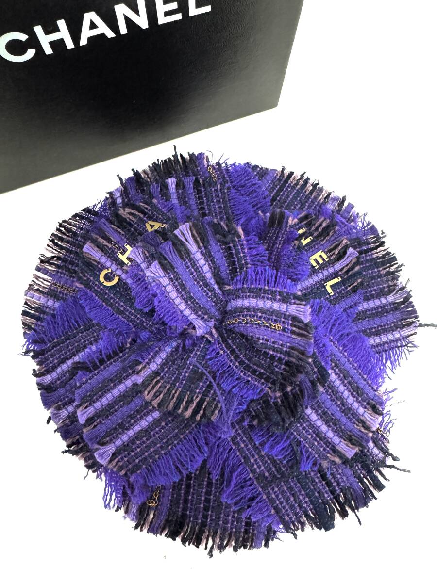 - 7I2809【本物保証】シャネル ブローチ 特大 カメリア ツイード パープル ブラック チェーン ロゴ ゴールド 01P CHANEL