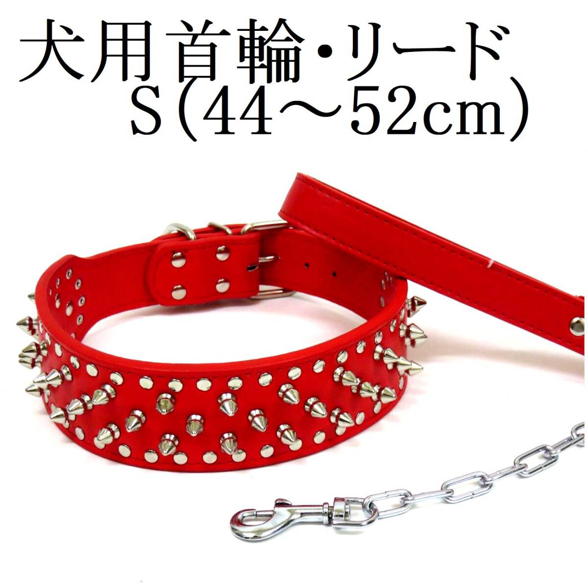 - 首輪 チェーンリード セット S 赤 大型犬 首回り44~52cm前後 幅5cm リード120cm スタッズ PUレザー トゲトゲ カラー レッド ペット 散歩