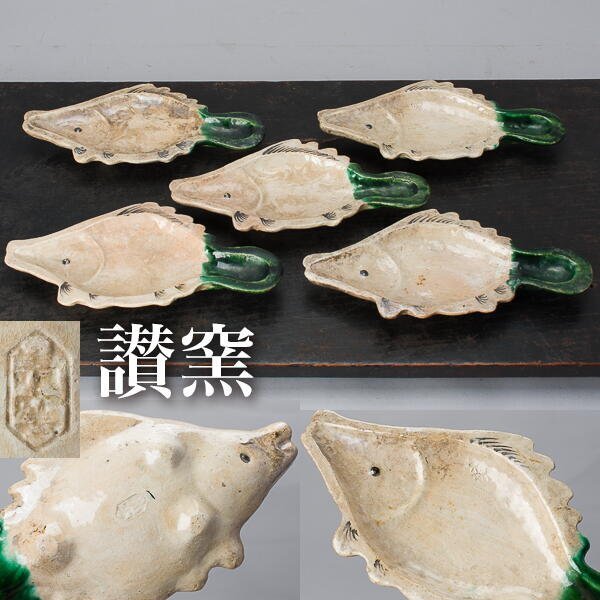 > 【千g943】讃窯 魚形 向付 5客 江戸時代 高松藩 御庭焼 仁阿弥道八 道八 皿 楽焼 織部
