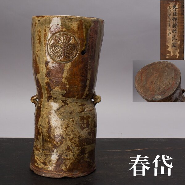 > 【千g330】加藤春岱 三つ葉葵紋 鼓形 花入 元治甲子年(1864年) 紀年銘 花器 花瓶 春岱 葵紋 江戸時代