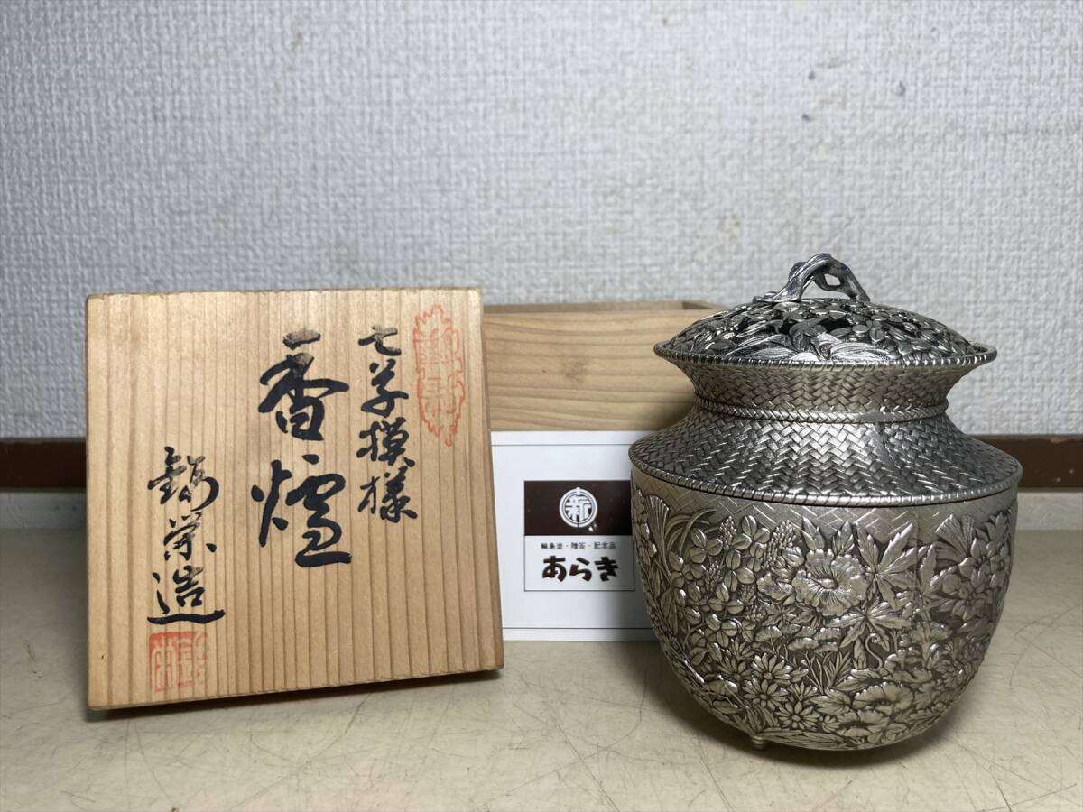 > 京都6☆ 香炉 七草模様 鍛栄造 銘有 高さ 約13cm 横幅 約9cm 重量547g 共箱付 現状品 煎茶道具 金属工芸