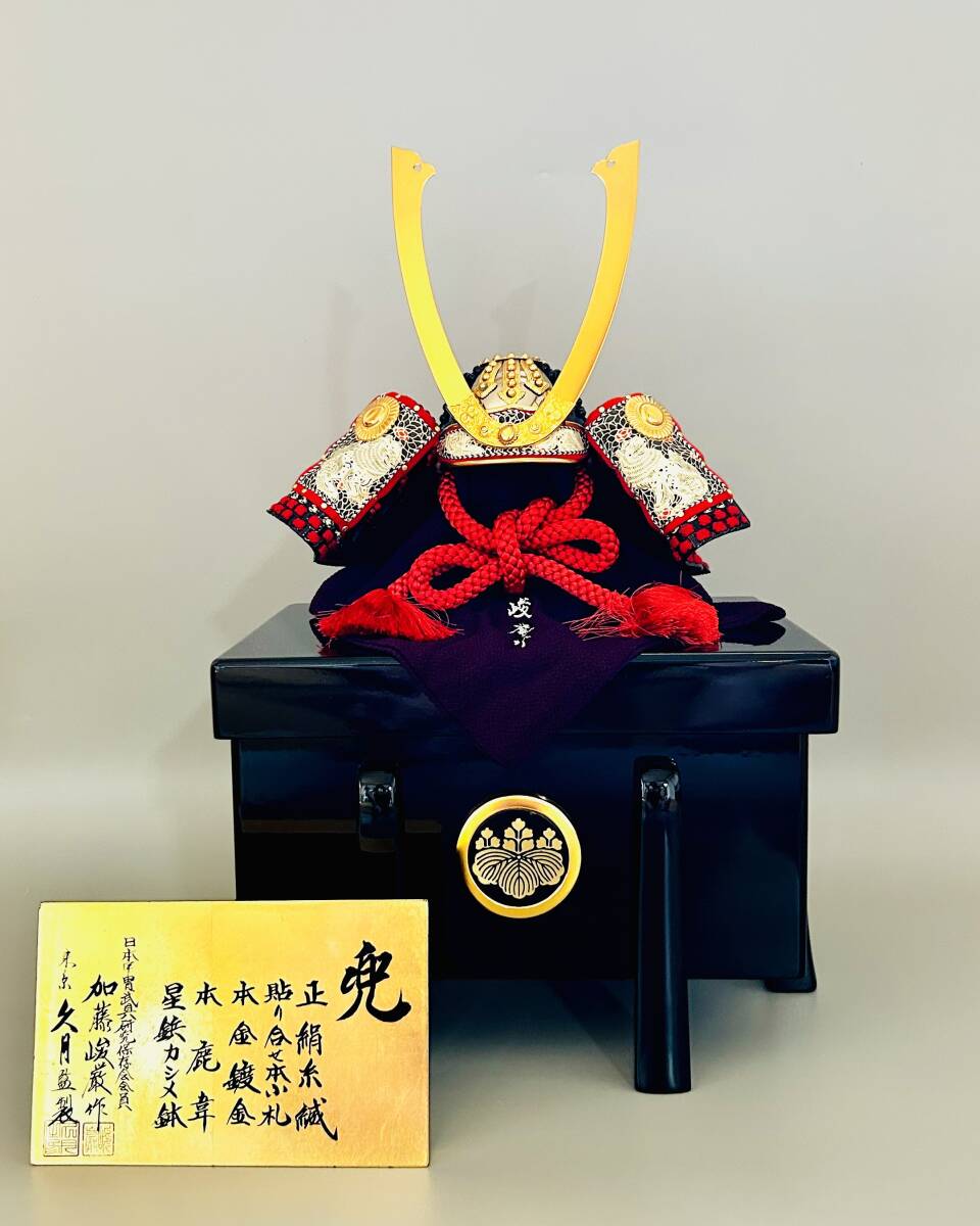 - 日本甲冑式具研究保存会会員 加藤峻厳 作「正絹赤糸威長鍬 三分ノ一兜」