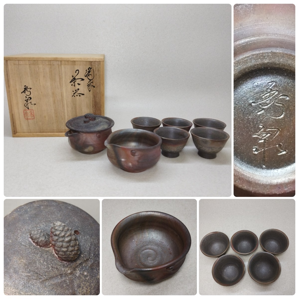 - 備前焼 煎茶器 秀泉作 未使用保管品 宝瓶 急須 泡瓶 煎茶碗 湯冷まし 古民家整理品a