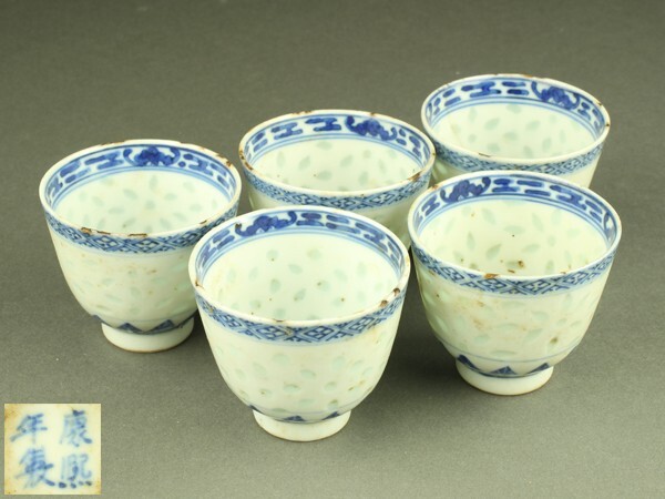 - 【宇】JB212 唐物 康熙年製 染付蛍手 煎茶碗 五客 煎茶道具