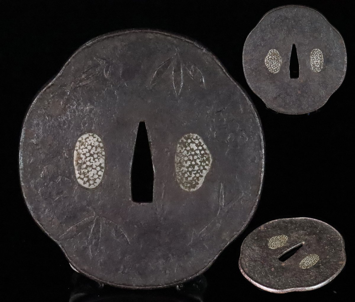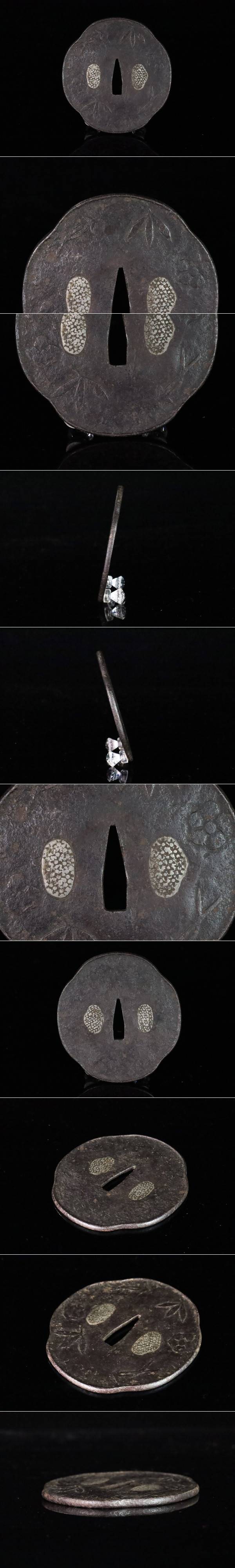 - 【ASAHI】 時代武具 鉄地 銀象嵌 家紋 笹紋 木瓜形鍔 大鍔9.53cm 日本刀 刀装具[79131qe]