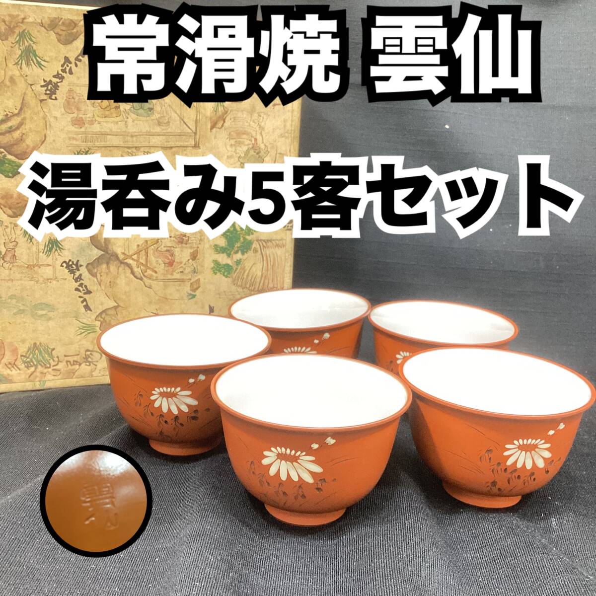 - 【未使用・保管品】常滑焼 朱泥 湯呑5客 花柄 紙箱付き 茶器 陶器 和食器 常滑焼 雲仙 手造り 陶器 とこなめ陶芸 (H1864)