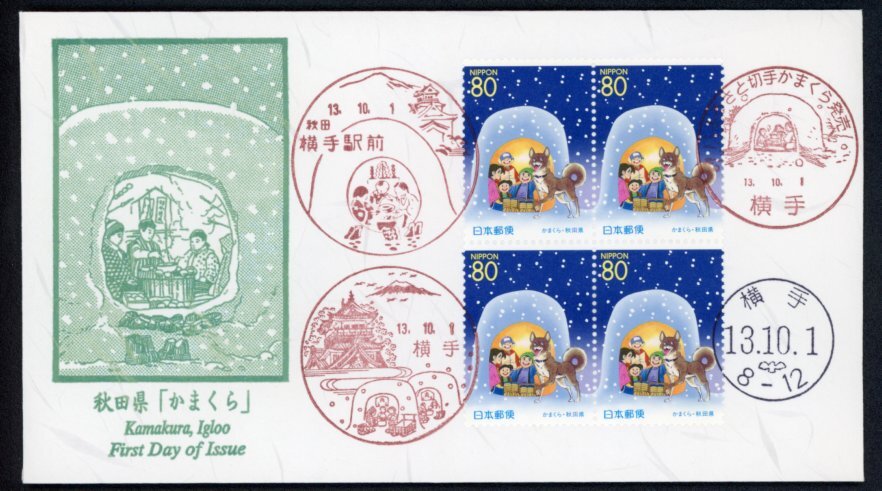 - 1095 【FDC】ふるさと 秋田県「かまくら」[横手駅前、横手/13.10.1/鳴美版](解説書なし)