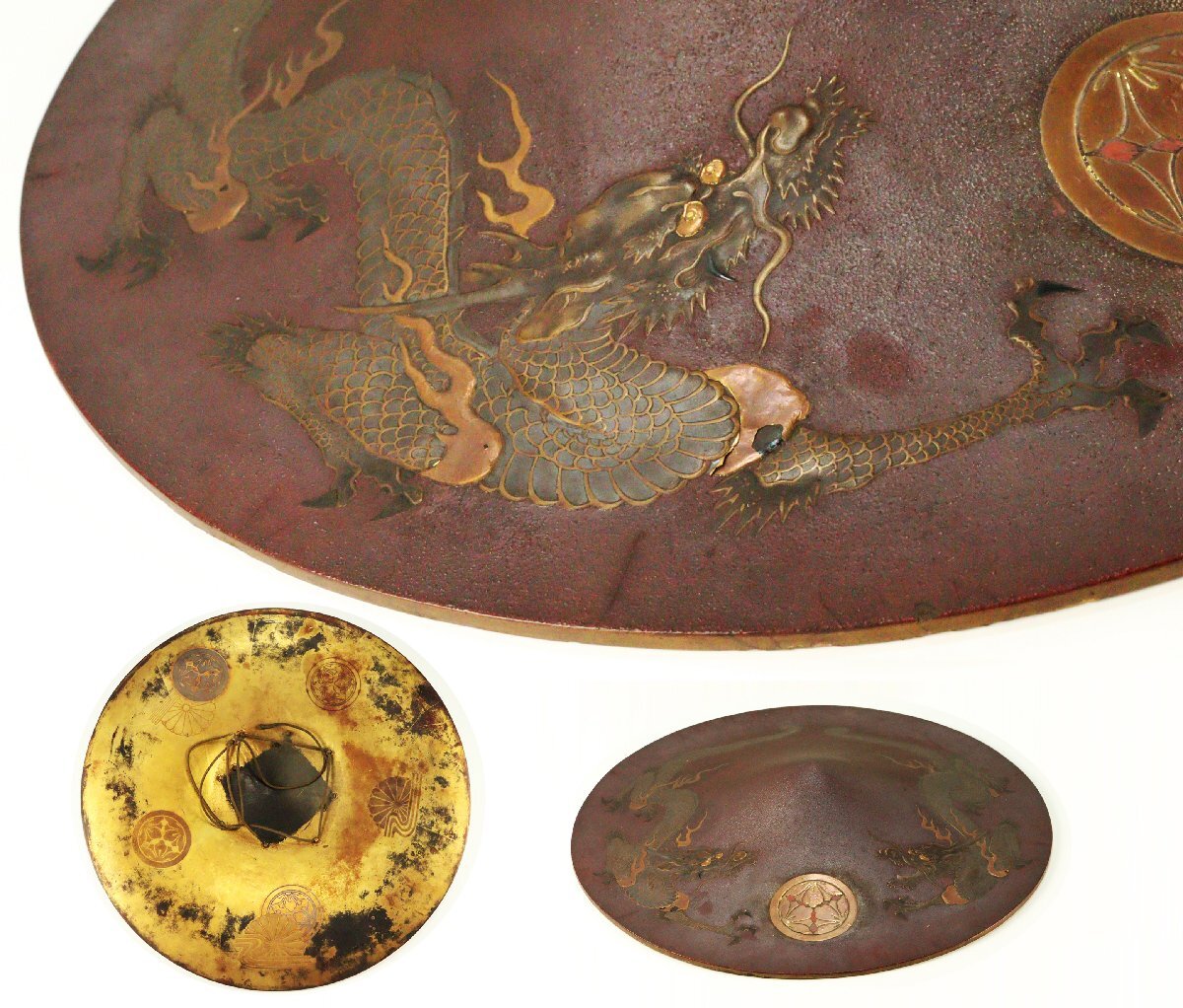 > 【ASAHI】江戸時代後期 本歌 最上作の造り込み 漆塗雲に双龍高蒔絵陣笠 家紋入 裏金塗 甲冑/鎧兜/具足 大名陣笠[79242eep]