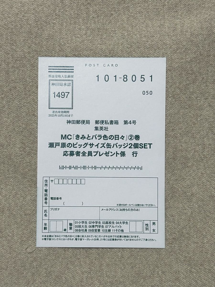 - 「きみとバラ色の日々」全員プレゼント応募ハガキ