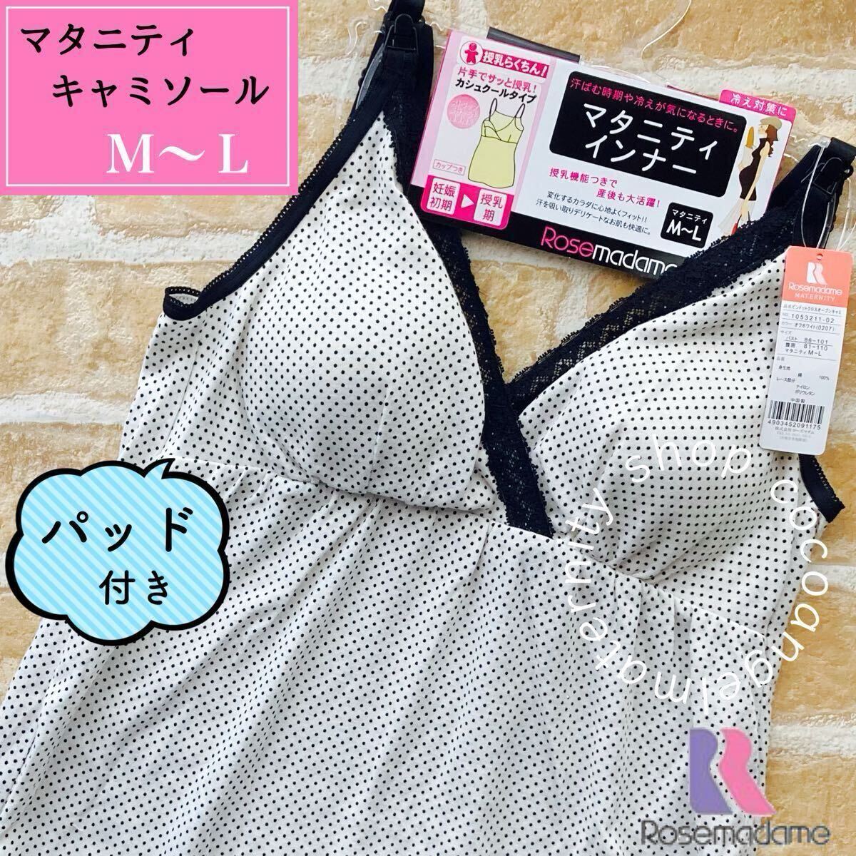 - 【産前-産後】新品 マタニティキャミソール M~L オフホワイト×黒ドット柄 綿100% 2wayオープン 授乳キャミ パッド付き お腹の冷え防止