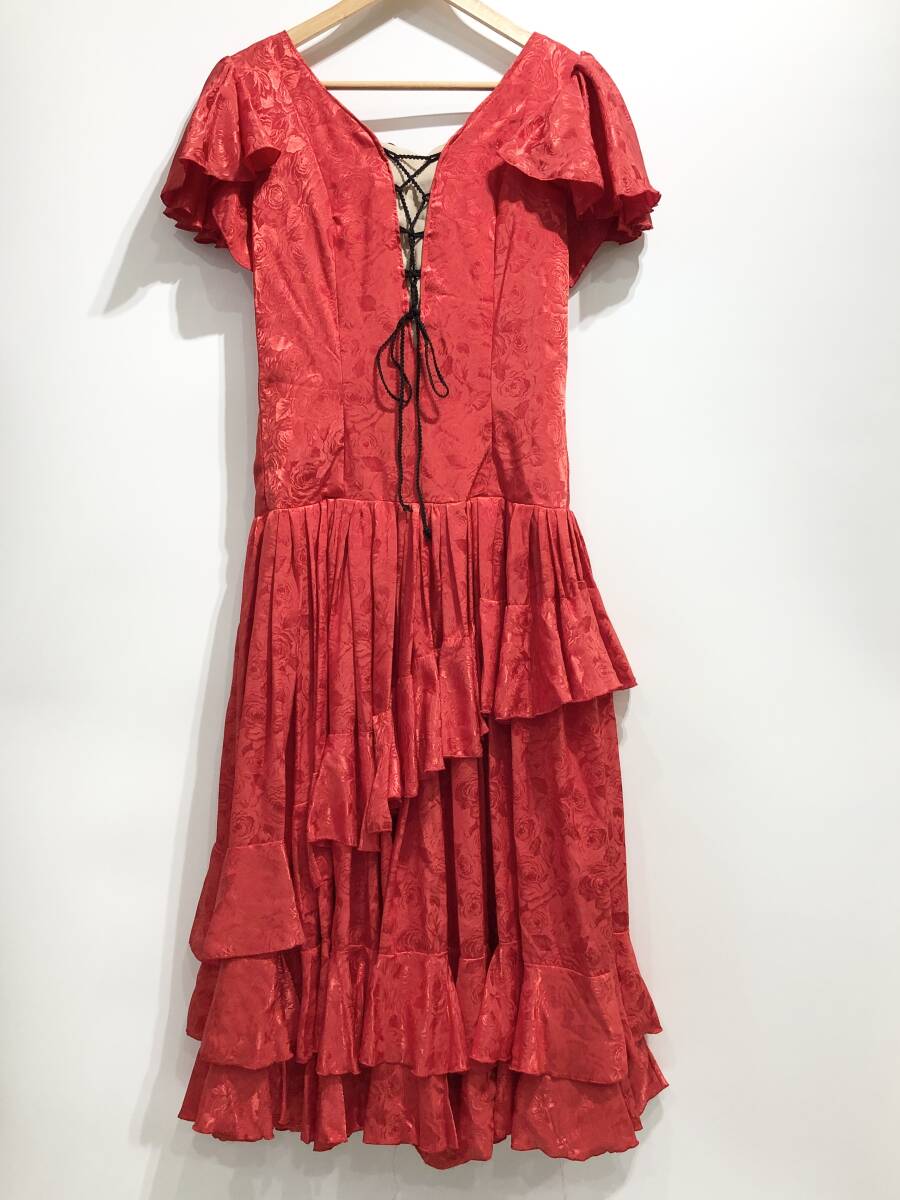 > 【古着】 花柄 ショートスリーブ ワンピース ドレス アシンメトリー ティアード フレア フリル 薔薇 バラ フラメンコ ダンス 衣装■0929H