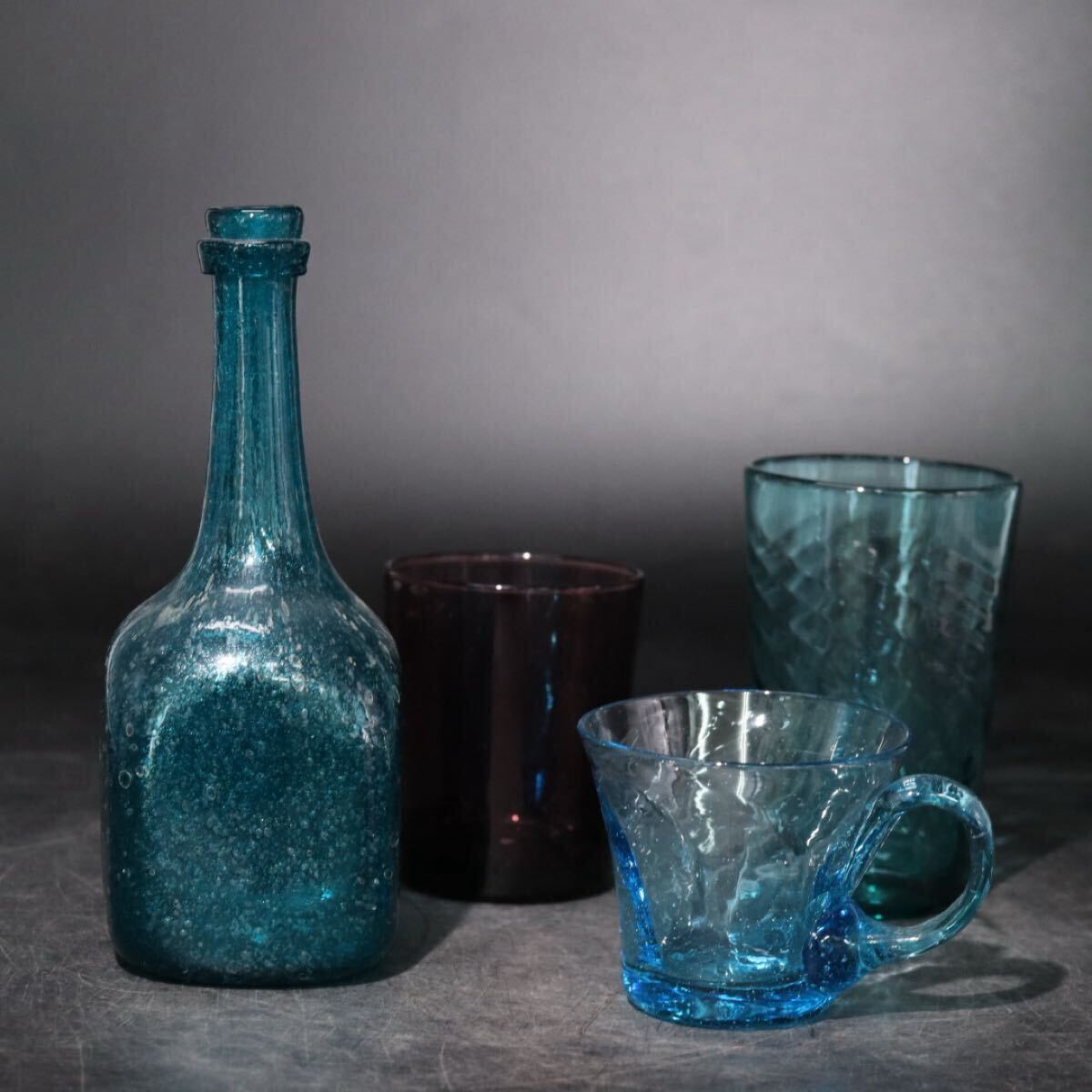 - 倉敷ガラス ・ 色ガラス ・ 手吹きガラス 花瓶 ・カップ 4点まとめて / 青色ガラス 瑠璃カネボウ化粧品 ノベルティ .B1136