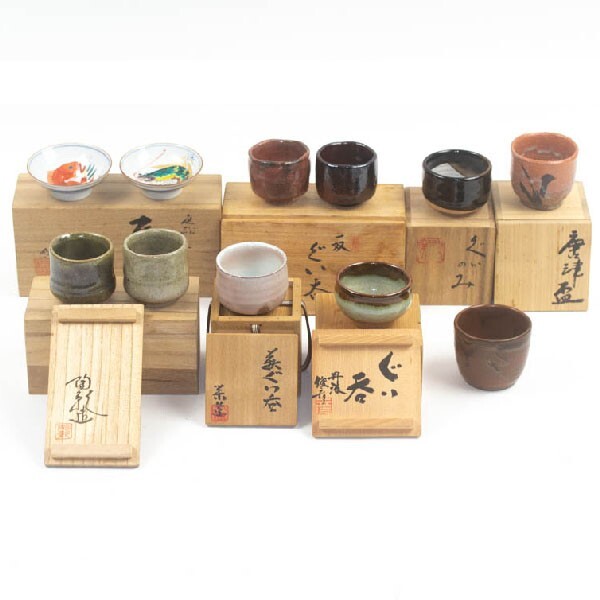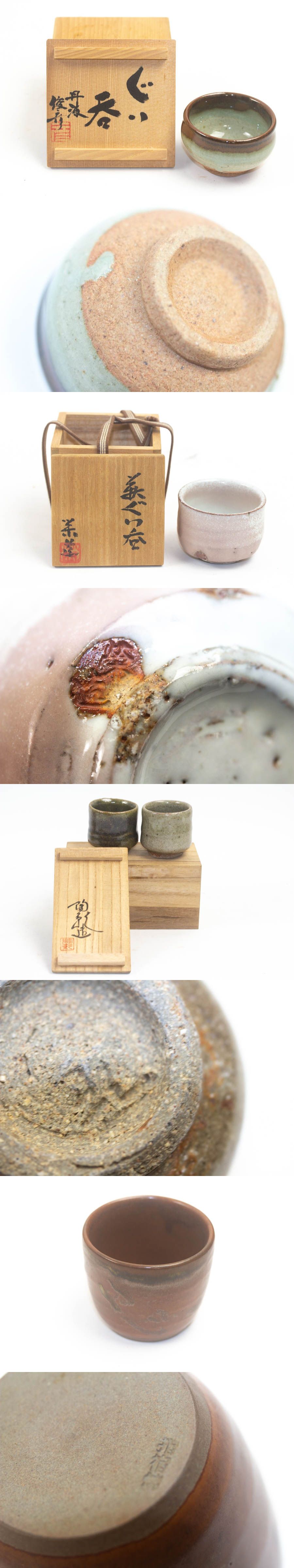 - 丹波 指宿焼 萩 唐津 九谷焼 加登明雄 海幸図 盃 他 ぐい呑み 酒器 工芸品 陶器 共箱付き・なし まとめて #19423