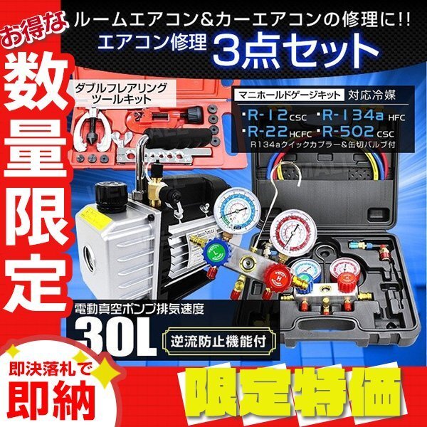 > 【限定セール】エアコンガスチャージ 3点セット 電動真空ポンプ マニホールドゲージ フレアリングツール R134a R12 R22 R502 ガス補充 修理