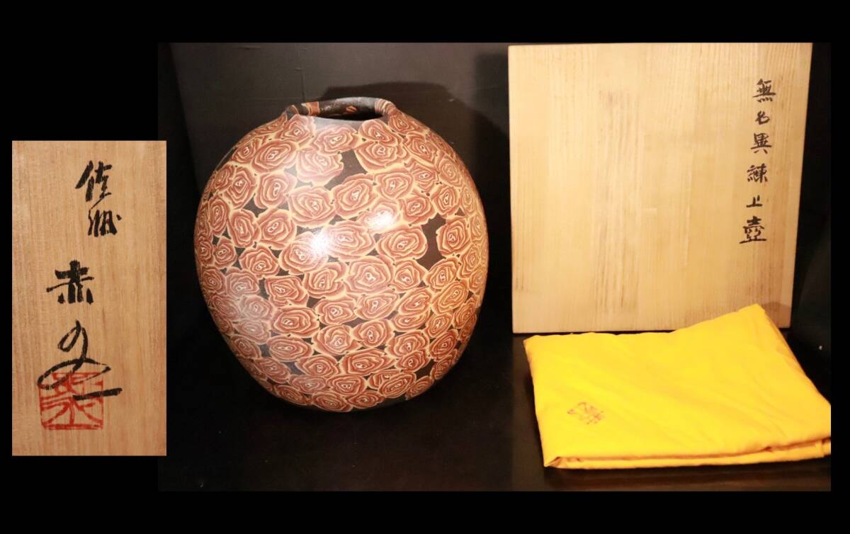 - 【hiro】最上級クラスの名品! 佐渡人間国宝 五代 伊東 赤水 造 無名異練上花紋大壷 共箱 ★検索★ オブジェ 花瓶 茶碗 香炉 置物 盃