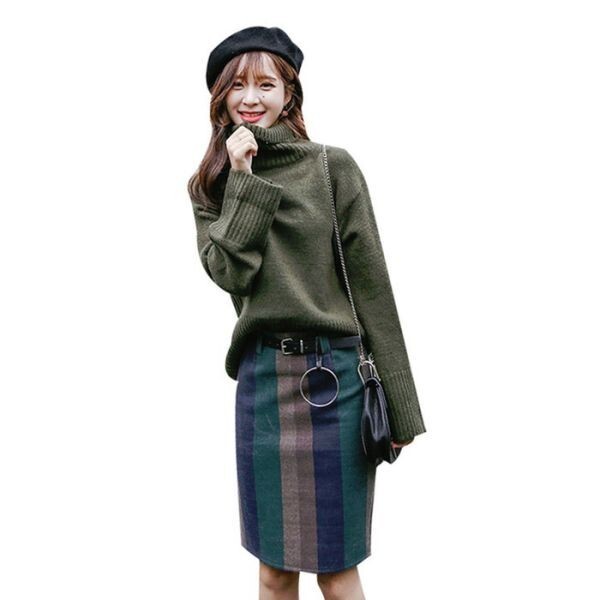 > 3色カラーのタイトスカート ベルト付き 膝丈 ストレッチ性生地 ストライプ柄 レディース ダークグリーン 膝上 M