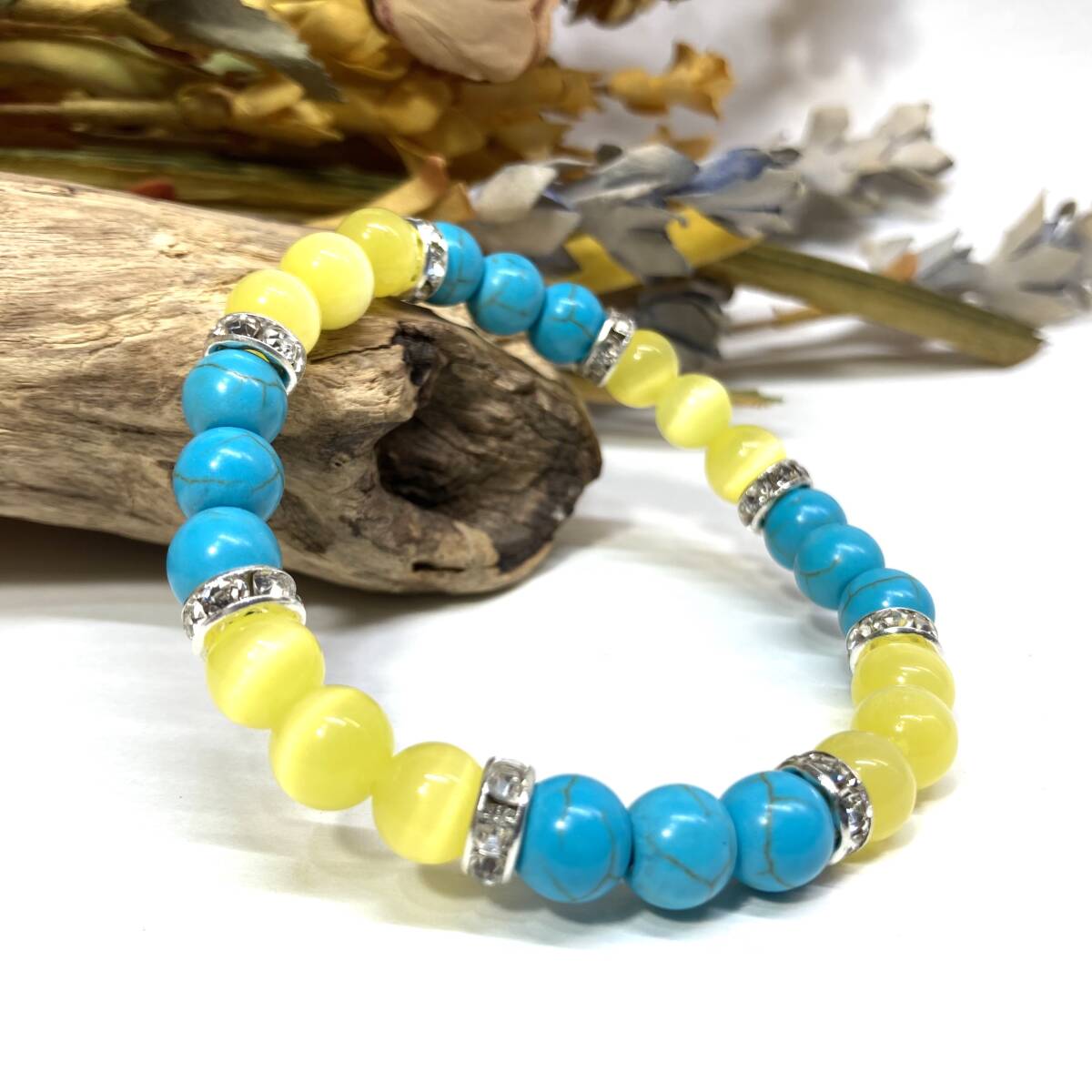 - ターコイズ&キャッツアイ(イエロー)パワーストーン ブレスレット(シルバー)メンズ レディース 男性 女性 開運 数珠 お守り