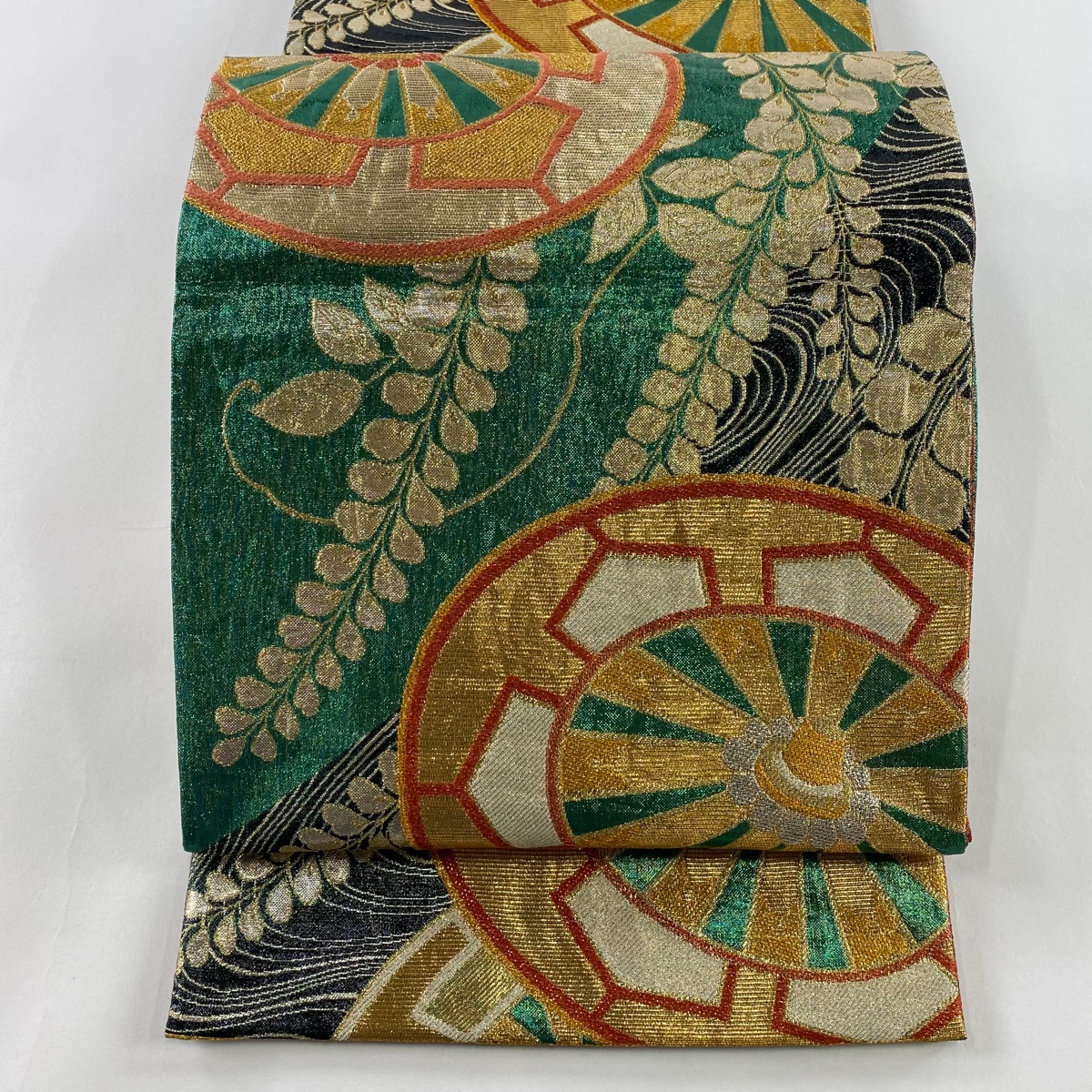 - 【美品】 袋帯 秀品 源氏車 藤 箔 緑 六通 正絹 【中古】